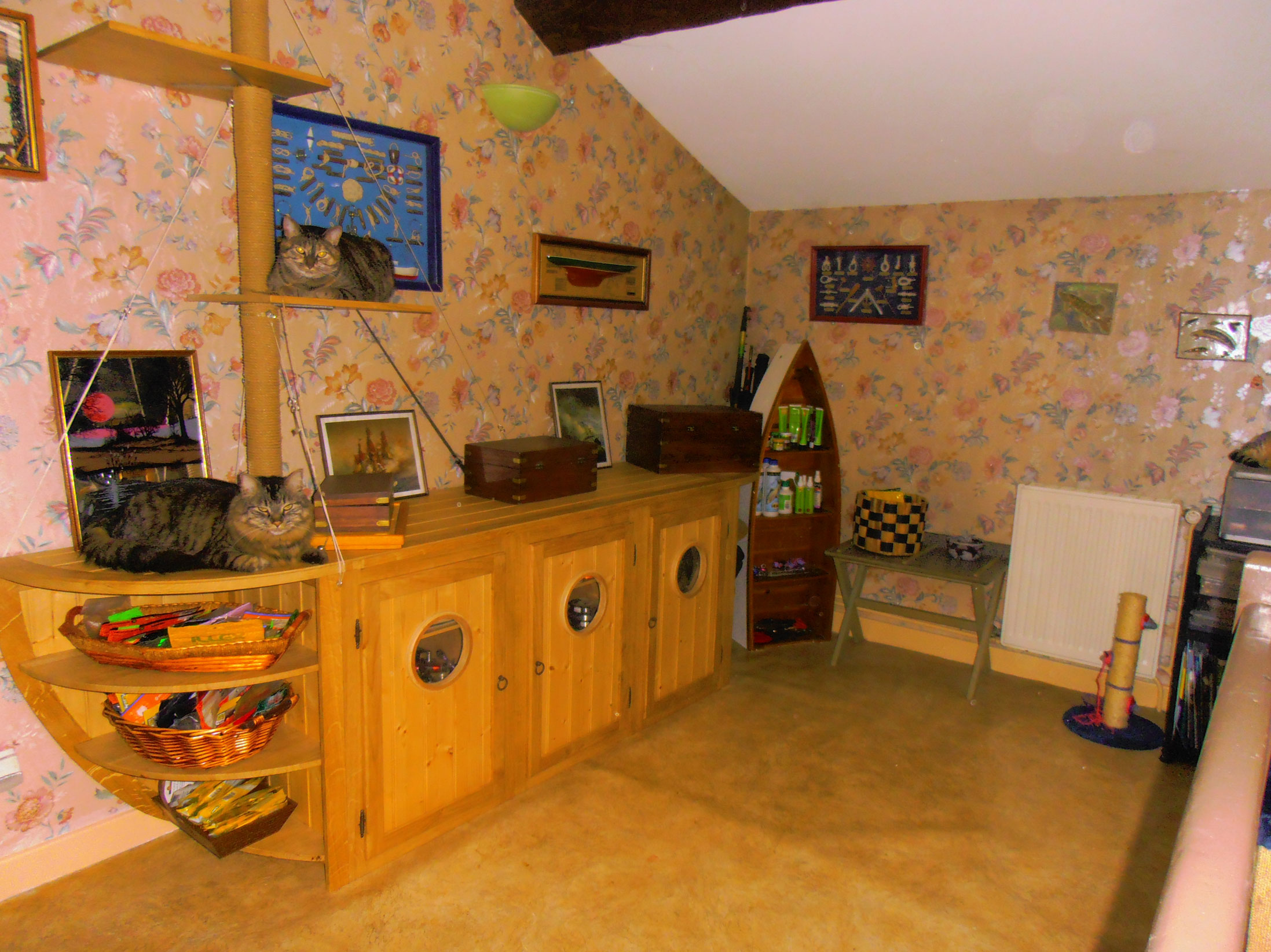 L’adresse rédaction pour le concours SOS coin de pêche étant introuvable,j’essaies de poster mes photos pour y participer,ici.Il s’agit d’une mezzanine entièrement consacrée à la pêche,avec un meuble fait maison,en forme de bateau.Des portants chaussures ont été détournés de leur focntion première,pour servir de porte-cannes.La décoration chinée dans des vide-greniers,est sur le thème de la mer ou de la pêche.Leurres,fils,hameçons,poids,moulinets,etc sont séparés et classées par taille et type.