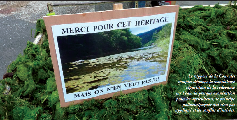 Ces établissements sont chargés de collecter, puis de redistribuer la redevance sur l’eau. Une bonne part de cette manne (13,6 milliards pour la période 2007-2012) concerne l’assainissement alors qu’une part minime va à la restauration et à l’entretien des cours d’eau et des milieux humides. Au passage, le rapport indique que les agences ont claqué quelques 14,9 milliards, soit un tantinet plus que prévu… « Conflits d’intérêts, manque de représentativité, manque de transparence, absence de contrôle », telles sont quelques unes des formules employées par les magistrats de la Cour des Comptes pour qualifier la politique de l’eau conduite en France par l’établissement public chargé de sa gestion. Dès 2010, la Cour européenne avait déjà pointé le manque d’efficacité de l’Agence de l’Eau, son laxisme dans la lutte contre les pollutions diffuses d’origine agricoles ainsi que son absence de politique volontariste en faveur de la restauration hydromorphologique des cours d’eau. Le 4 septembre 2014, la Cours de justice européenne a condamné la France pour manquement à la directive de 1991 sur la pollution des eaux par les nitrates d’origine agricole.