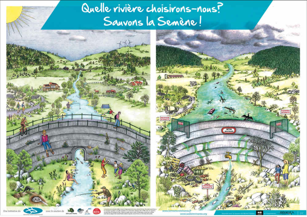 C’est pourtant ce qui se passe dans de nombreux cas. A croire que le marketing mensonger à sa place même au ministère de l’Environnement. Après l’annulation de l’arasement de deux barrages sur la Sélune par Ségolène Royal (ça avait été accordé par NKM), après l’affaire Sivens, voici celle du barrage des Plats sur la Semène dans le département de la Loire. La Semène est un affluent direct de la Loire.