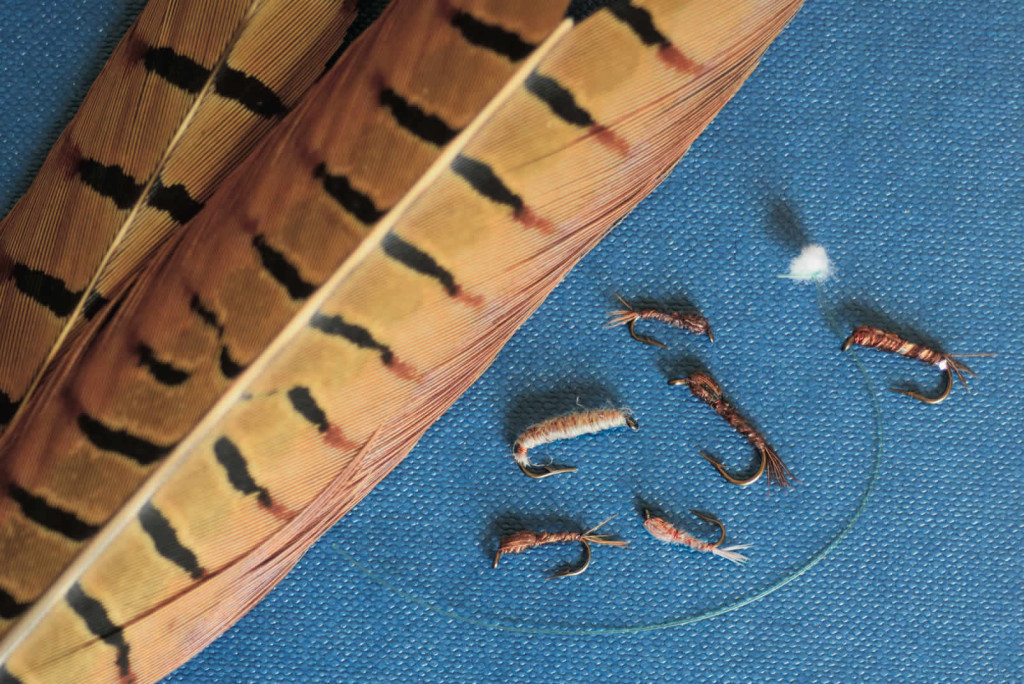 La plus célèbre de toutes les nymphes se monte avec un fil de cuivre qui sert à la fois de leste et de fil de montage. L’hameçon utilisé par Sawyer dans les années 1970 est probablement un Partridge en fer forgé plutôt fin pour l’époque. Sa forme est des plus standards. Les modèles en ma possession sont montés en tailles 18, 16 et un petit 12. Avec Cyril et Florent Bailly, nous avons essayé tous les trois de monter des pheasant tail à la façon de mister Sawyer, par simple curiosité. Nous n’y sommes pas parvenus pour la bonne et simple raison que les herls de plume de queue de faisan dont nous disposions étaient trop courts. Pour obtenir le parfait ovale du thorax de sa nymphe, Sawyer rabat les herls quatre fois. Il faut savoir que dans la campagne anglaise du milieu du siècle dernier, le sport national était la chasse au faisan en battue. Les anglais ont toujours été les champions de l’élevage de cet oiseau originaire d’Asie. Nul doute que Sawyer savait où se procurer des plumes d’une qualité exceptionnelle. Les plumes des faisans que l’on trouve actuellement dans le commerce proviennent d’animaux dégénérés, élevés de façon intensive, qui risquent tout autant le pare-choc de voiture