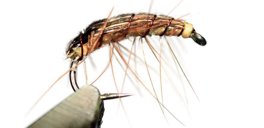 Une imitation de gammare parmi tant d’autres, mais pas n’importe lequel car il fut sans doute le premier à être destiné spécifiquement aux grosses truites sauvages, notamment celles de la Bienne dans le Jura ou du Chéran en Haute-Savoie. L’ ami Bernard Maillet, (que je salue au passage !) fut l’un des premiers pêcheurs à la nymphe à se spécialiser dans la pêche des grosses truites à vue sur ces rivières aquarium qu’il connaît parfaitement. Aujourd’hui encore, la BM 22, référence de ce gammare dans la collection des Mouches de Charette, fait partie des meilleures “nymphes” pour la pêche à vue des truites sauvages. La version commercialisée est plus fournie en hackle et de ce fait se trouve plus proche de ce qui se faisait il y a trente ou quarante ans. La version proposée ici a été allégée pour mieux correspondre à ce qui plaît aux poissons actuellement. A ce propos, Bernard déteste les gammares trop fournis, qu’il qualifie volontiers de “brosses à dents” ! Le rôle des pattes en hackle de coq roux consiste surtout à ralentir la descente de la bête pour lui donner un coté “suspending” qui est primordial, surtout juste après une petite animation qui a pour but d’attirer l’attention de la truite. Rien que d’y penser, j’ai la chair de poule en imaginant les deux yeux globuleux et mobiles d’une grosse truite qui vient de repérer la petite crevette dans sa phase de descente et qui s’en approche pour venir l’aspirer ! La pêche avec une BM 22 imprime dans nos têtes des images inoubliables ! Quatre tours de hackle suffisent à créer cette irrésistible attractivité qui met véritablement cette nymphe enapesanteur dans la couche d’eau. La BM 22 est surtout utilisée sous la canne pour les truites qui rodent le long des bordures, mais elle peut tout aussi bien prendre des truites à distance, notamment dans les secteurs calmes, où sa façon de couler est tout aussi crédible.