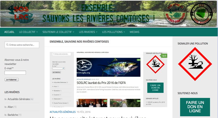 Le Collectif SOS Loue & Rivières Comtoises vient de mettre en ligne son nouveau site Internet. Clair, informatif, à la portée d’un large public, il a pour mission de renseigner sur le combat mené par le Collectif, de présenter les rivières, les différents types de pollutions, mais aussi d’aider les membres à lister les points noirs, à signaler des pollutions ou à faire un don. Il a donc un rôle de portail très accessible mais qui renvoie la lecture des gros dossiers, des études et de tous les documents importantes que le Collectif a archivé depuis cinq ans sur le premier site www.arrete.net/
