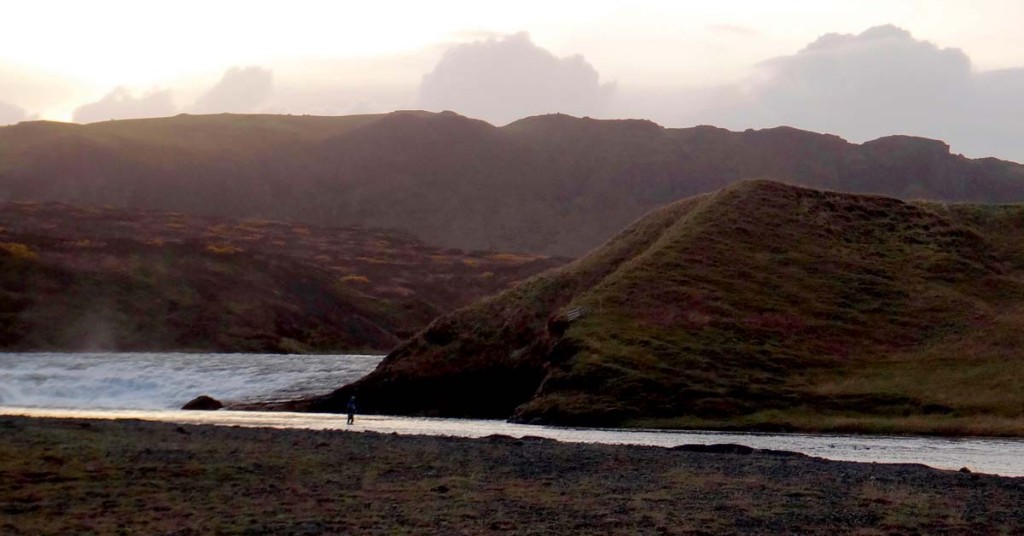 Le vol Icelandair 541, parti de CDG à 8 h du matin, nous avait déposé en ce 6 octobre à 9 h 20 (heure locale) sur l’aéroport de Kefl avik et à 15 h 30 nous arrivions au lodge de pêche, après avoir fait provision de “langoustinurs”, “kotileturs” et spaghettis. Les courses sont rangées plus vite qu’aucune bonne ménagère ne saurait faire… les grosses truites de mer nous attendent. A 16 h 30, nos cannes sont montées et les waders enfilés. J’ai distribué de grosses mouches noires à tout le monde. Nous nous répartissons en deux équipes, une qui montera vers les pools de l’amont, bien indiqués sur la carte du lodge. Quant à moi et Guillaume nous optons pour l’immense pool juste en bas du lodge. Anticipant le mauvais temps avec nécessité de lancer contre le vent dans ce qui m’était apparu sur le site de Lax-A, comme une assez large rivière, où les truites de mer peuvent atteindre 15 et même 20 livres, j’avais pour une fois en Islande, délaissé mes cannes en bambou “vintage” à une main et opté pour ma vieille Loop 12 p Grey Line.