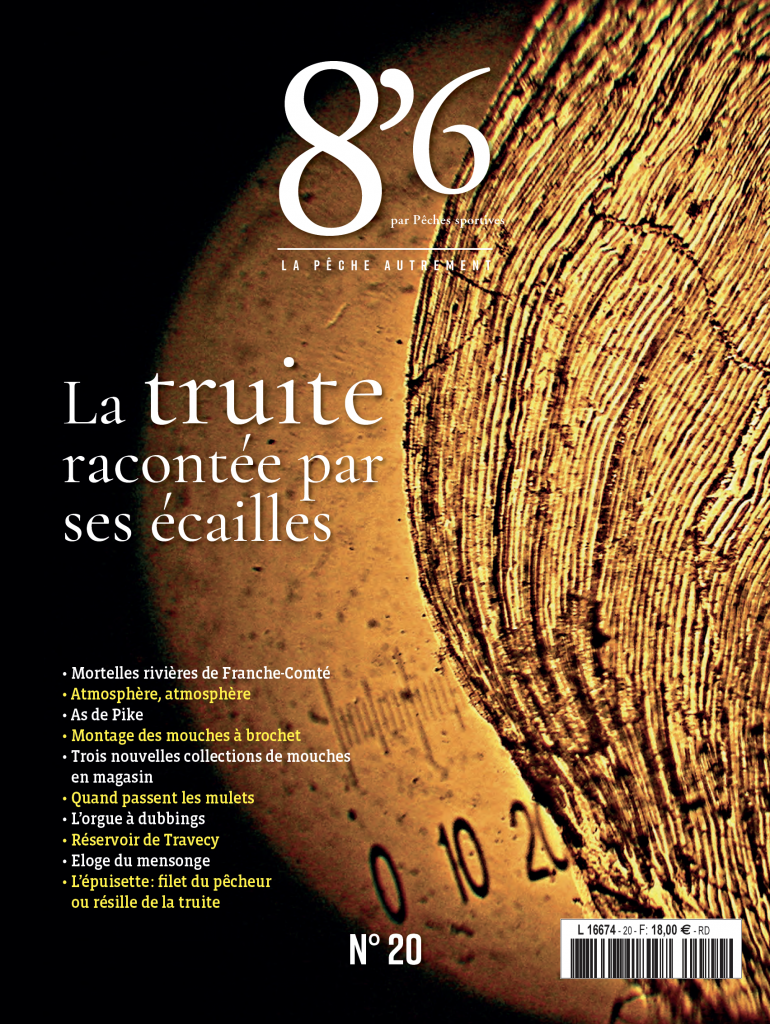 Dans ce numéro d’hiver, 8’6 nous fait découvrir l’art de la scalimétrie, qui permet d’estimer l’âge des poissons, celui de leur maturité sexuelle mais qui révèle aussi leur migration en mer ou en lac. C’est aussi l’occasion de découvrir ou de redécouvrir la pêche du brochet à la mouche, dont le nouveau matériel, notamment les soies plongeantes rend la technique plus efficace et moins rébarbative que par le passé. Nous vous emmenons également sur les plages du Débarquement en Normandie pour une pêche à la mouche du mulet doré qui ressemble étrangement à celle du bonefish. Philippe Collet nous sert de guide sur le réservoir de Travecy dans l’Aisne, alors que Jean-Christian Michel nous fait partager sa vision des paysages dans lesquels il pêche.