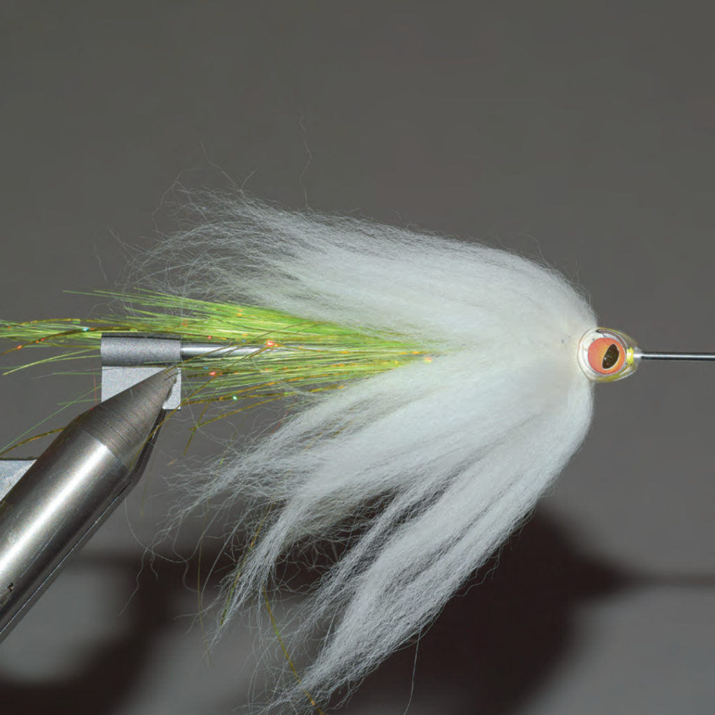 Les mouches à brochet sont souvent des créations auxquelles il faut bien trouver un nom… Celle-ci comporte une collerette en lapin angora, un poil long qui pulse dans l’eau et qui plaît beaucoup aux brochets. A ne pas monter en grandes tailles, car le lapin angora est très lourd lorsqu’il faut le relancer.