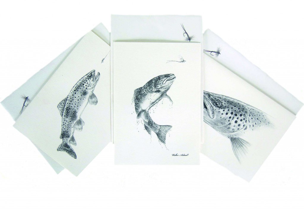Lot de 6 cartes de correspondance avec enveloppes. Truites fario, illustration de l’artiste Walter Arlaud. Format : 11,4 x 16,2 cm (format de l’enveloppe) Papier Vergé de France, 210gr/m².