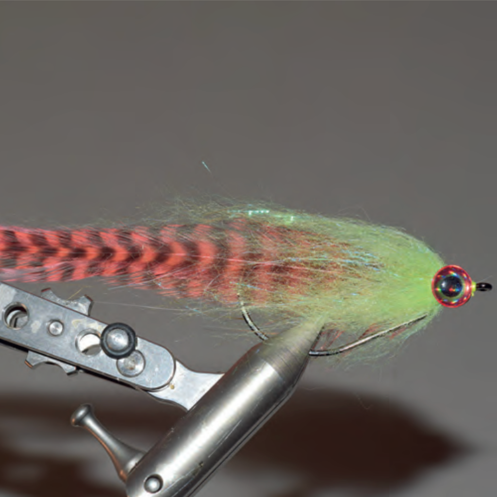 Les longues plumes de coq chinchilla sont un classique des mouches à brochet. Elles donnent de la longueur, de l’épaisseur à la mouche tout en restant très légères. Au lancer, cette mouche de 18 cm se fait oublier. L’hameçon texan permet de pêcher dans les endroits encombrés.
