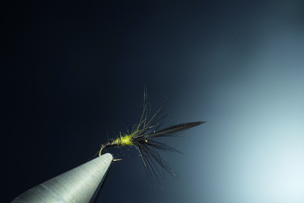 « Mouche très rapide à faire, bicolore, une laine après l’autre, nœud final en queue. » L’aile est quasiment dans l’axe de la hampe de l’hameçon, car la mouche se tient verticalement.