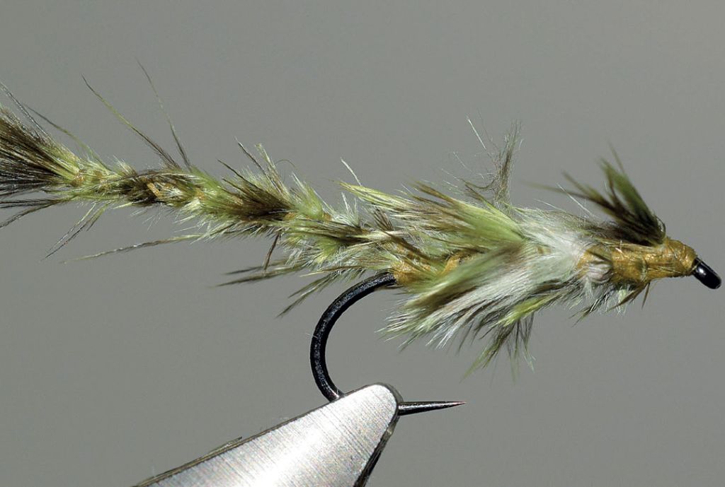 La larve de libellule, aussi appelée demoiselle, est une excellente mouche pour la pêche en lac. Cette version à corps détaché permet de découvrir une autre facette de la plume marabout grizzly.