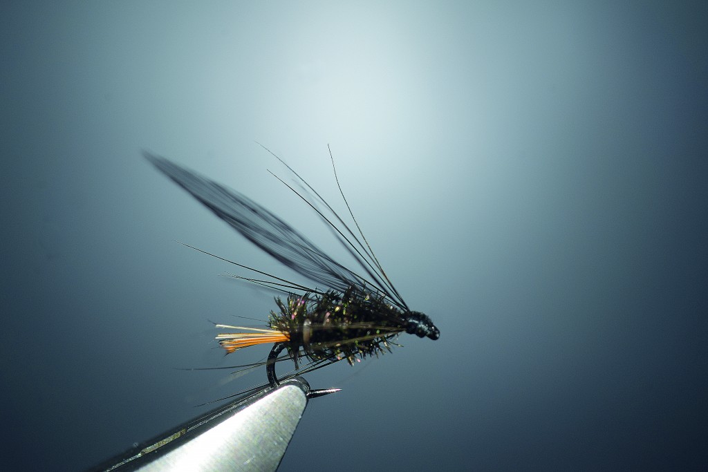 « C’est le Little Chap de Skues qu’il montait avec une plume de poule noire. J’ai essayé avec la poule noire mais elle est mate et ça va mieux avec un hackle noir brillant ou un gris acier foncé : à ce sujet, j’ai toujours trouvé qu’un gris foncé pêchait mieux qu’un clair, sauf si le clair est cristallin, “indio plateado” ou “cristal” en Espagne, qui est encore plus rare ».