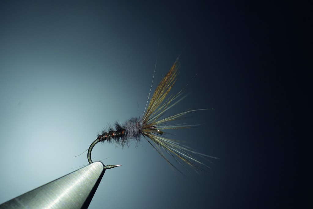 « Corps en fibres de marabout marron foncé teint, longues plumes JMC de très bonne couleur (y compris pour les nymphes). Les fixer par leur extrémité fine mais fragile (il est possible d’en enlever un bon centimètre si trop fragile). Les torsader avec le fil, c’est plus solide. J’avais pensé initialement à un corps de Pheasant Tail Spinner de Skues avec deux ou trois fibres de sabre de faisan marron rougeâtre cerclé or et soie de montage orange, mais le marabout se noie mieux pour l’insecte mort, particulièrement les mâles, plus foncés et bruns que les femelles.»