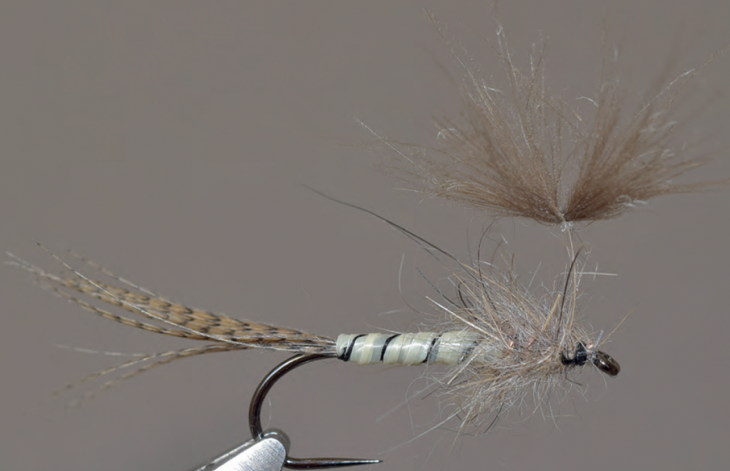L’émergente de Philippe Boisson est d’ordinaire plutôt montée en petites tailles, mais à condition de limiter la longueur du fil à 6 ou 7 mm. Elle peut s’adapter au montage de la nymphe de mouche de mai. Le corps de la nymphe est identique au modèle à densité compensée, à l’exception du thorax.