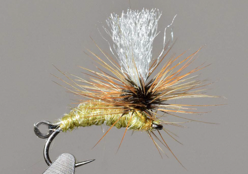 Avec l’assise sur l’eau de la colerrette à plat, le montage klinkhammer se prête bien à la pêche à deux mouches. Pour cela, un micro·anneau est placé à la base du corps.