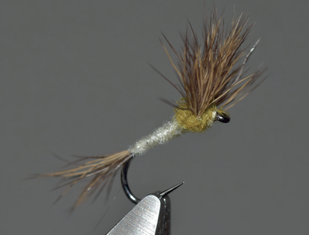 Pour imiter la grande famille des “olives” au stade de subimago, le montage comparadun convient parfaitement. Choisir un dubbing très fin de type Fly-Rite pour les modèles en taille 18, 16 et même 14. Pour ce modèle, seul le thorax est de teinte olive alors que le corps est jaune pâle. Le contraste est parfois une bonne option.