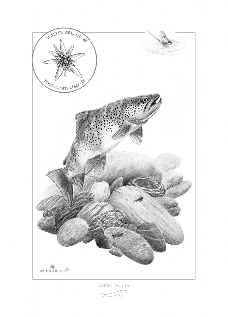 Truite fario en chasse / Salmo trutta (nom latin), Edition ouverte tirée d’un dessin original de l’artiste Walter Arlaud.