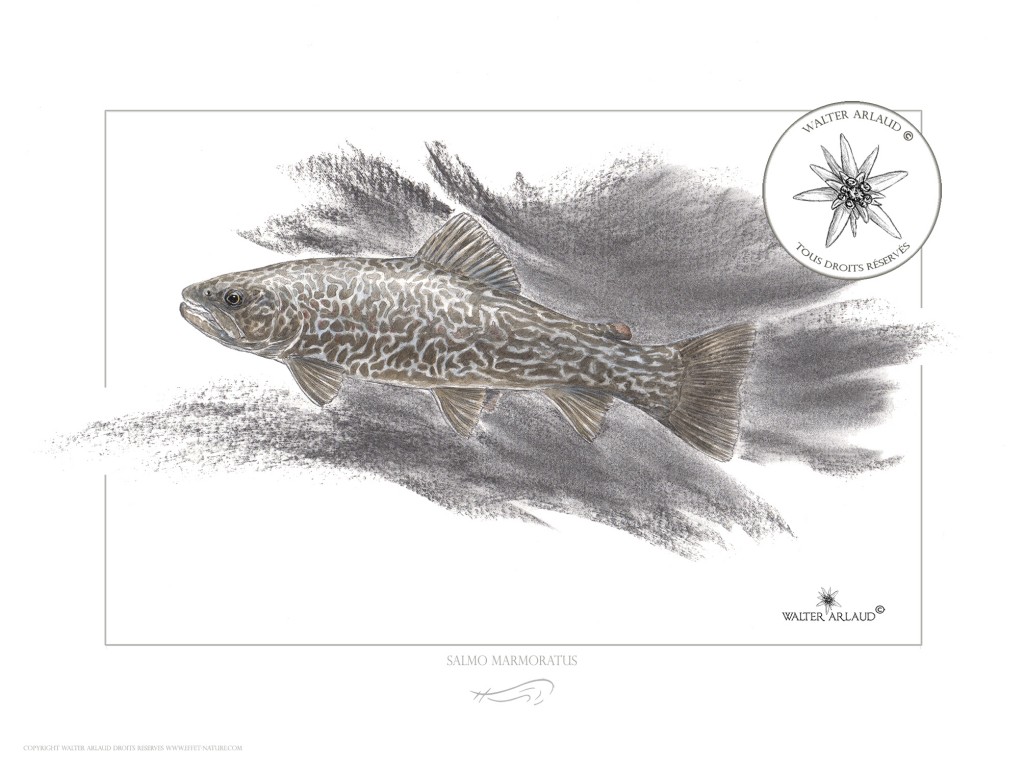 Truite marbrée / Marmorata / Salmo marmoratus (nom latin), Edition ouverte tirée d’un dessin original de l’artiste Walter Arlaud.